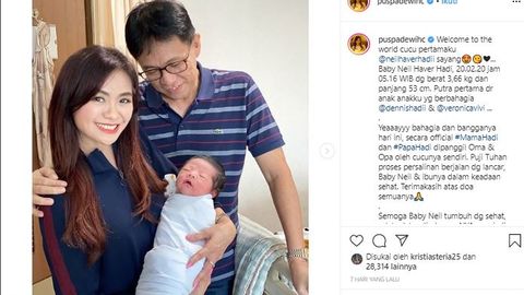 Unggahan Puspa Dewi tengah menggendong cucu pertamanya dengan suaminya berdiri di sampingnya.